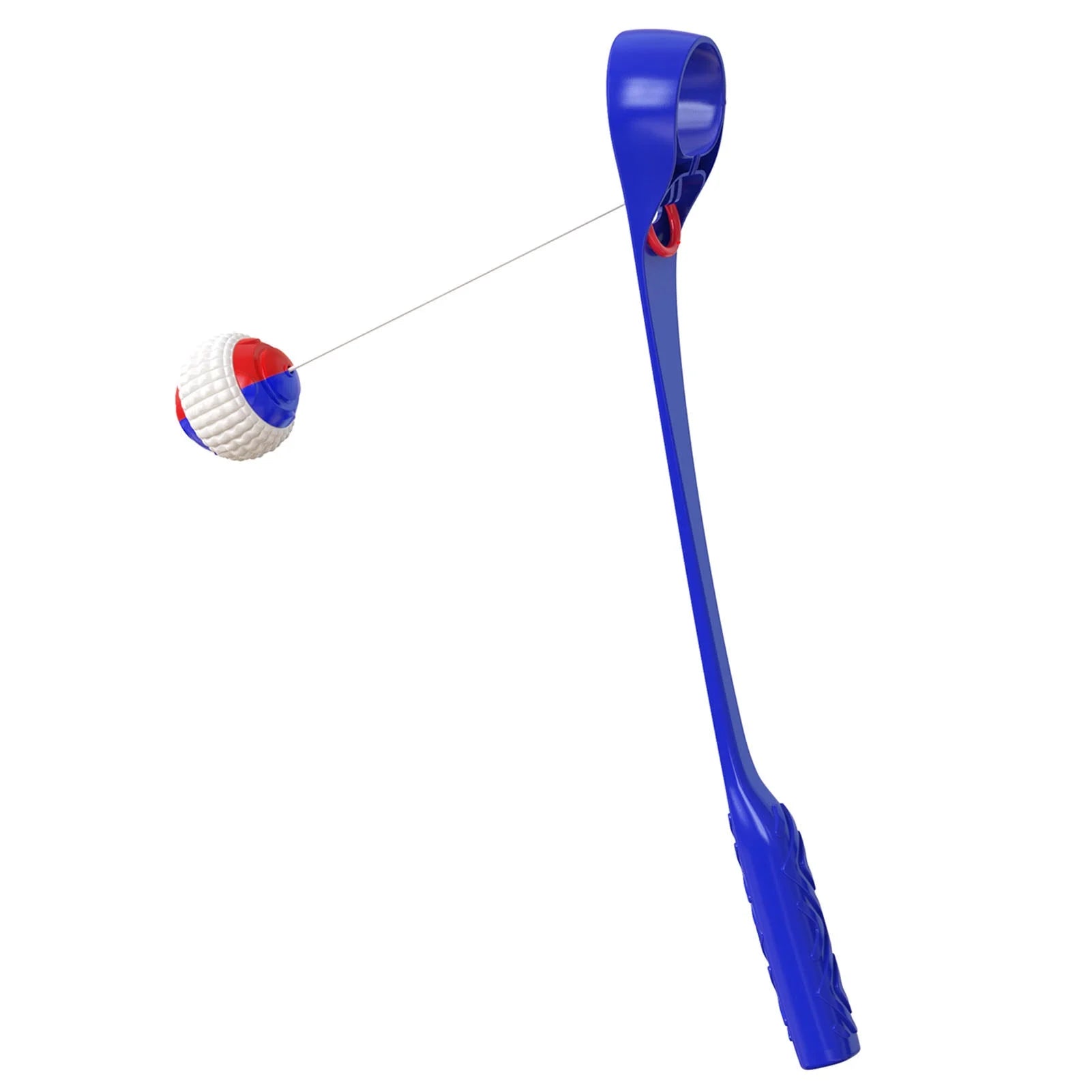 The ball is attached to the stick with a retractable string contraption. NICE! Now when we go to the park, my baby girl is the only one putting in any effort. Just the way I like it. :)