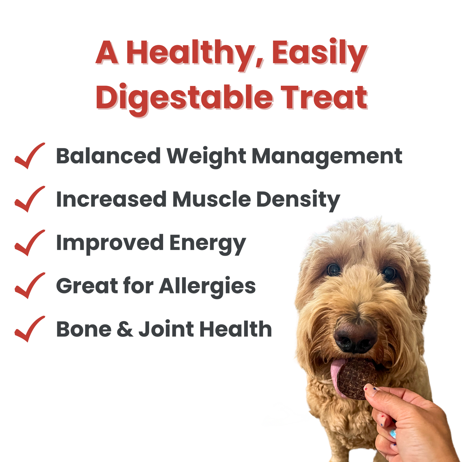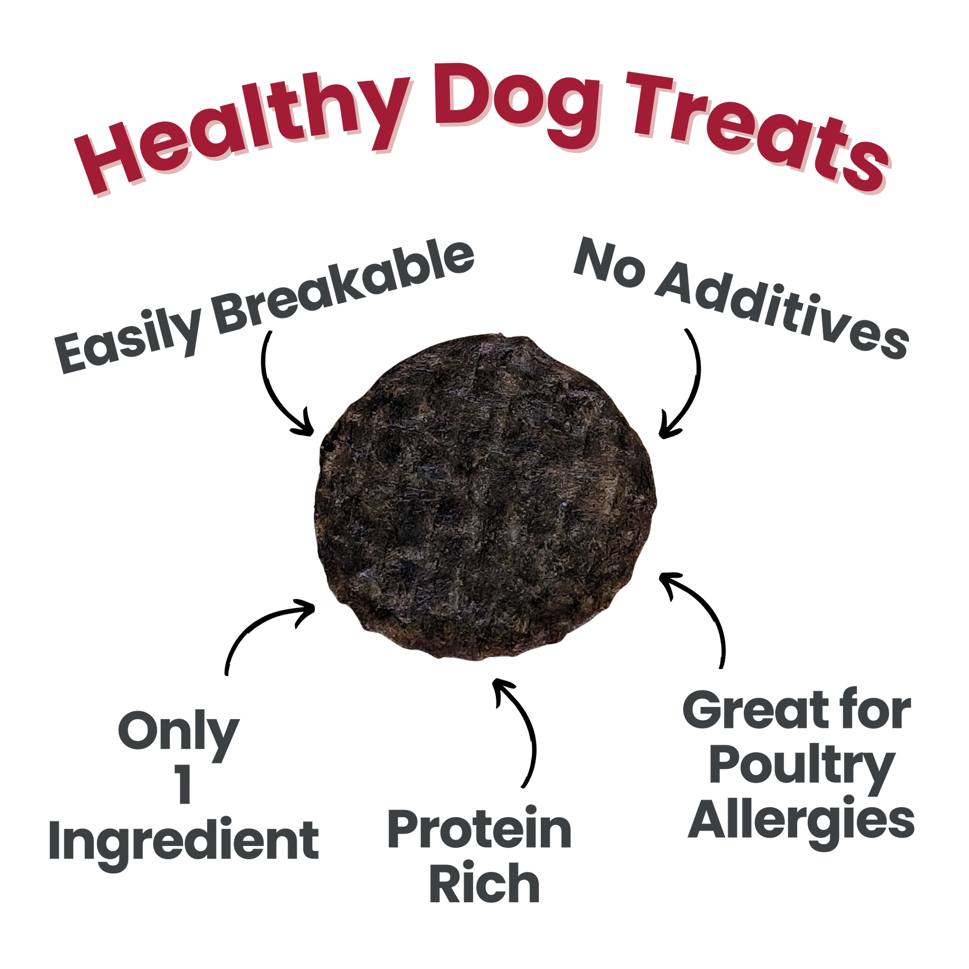 Made in the USA of all-natural, locally sourced, human-grade beef round, our crunchy single-ingredient Beef Chips are the perfect iron-rich healthy treat for dogs! - Packed with protein and nutrients - 6 low-fat calories per chip - No additives, fillers or preservatives - Gently dehydrated, easy to digest for pets with sensitive stomachs Ideal high-value mess-free dog and puppy training treats