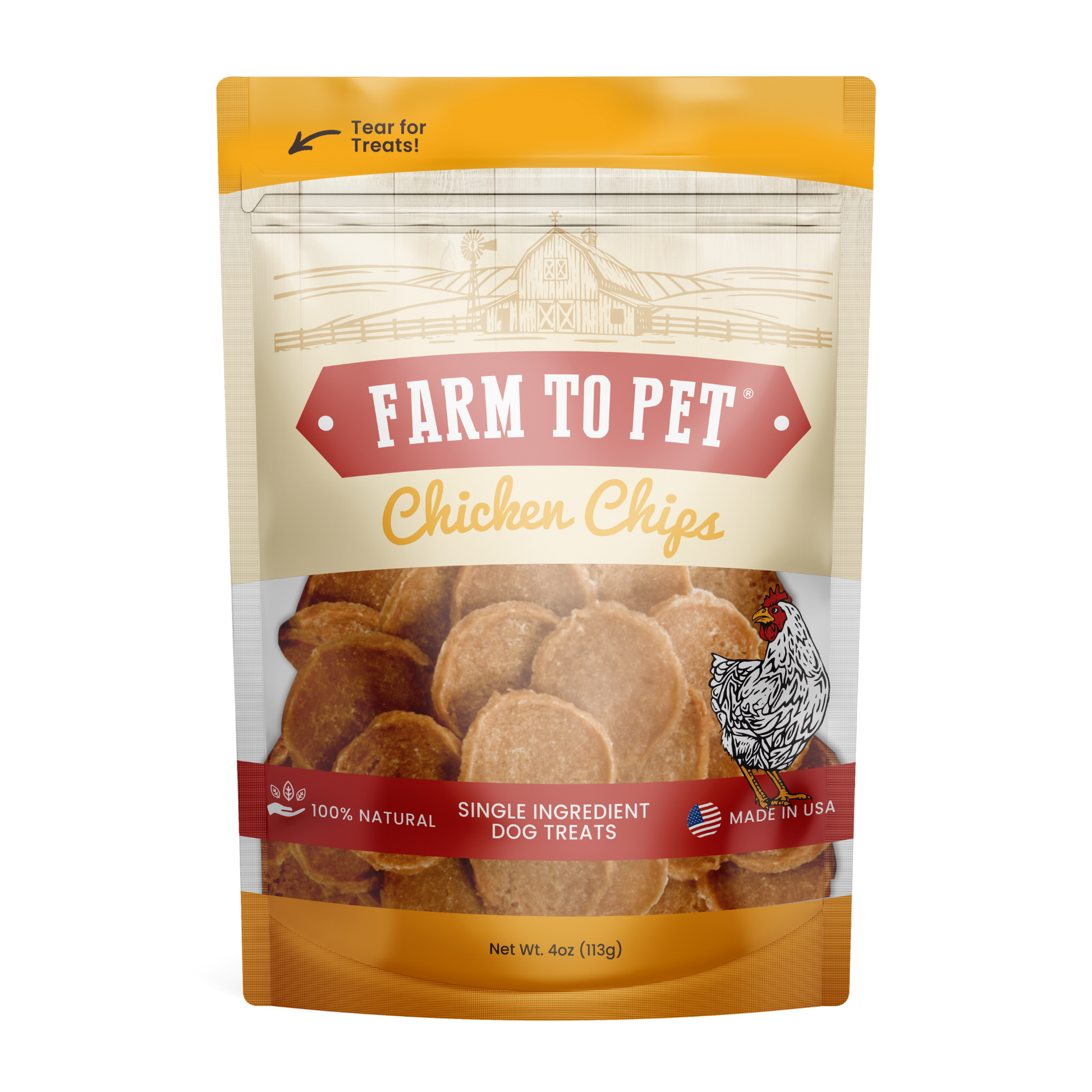 Made in the US of 100% pure, human-grade chicken, Farm to Pet Chicken Chips are the perfect healthy treat for dogs - and cats, too! Packed with protein and essential nutrients and low in fat and calories, these crunchy, single-ingredient pet treats contain no additives, fillers, or preservatives. Great as a training treat for dogs of all ages, these tasty morsels are also easy to digest for pets with sensitive stomachs.