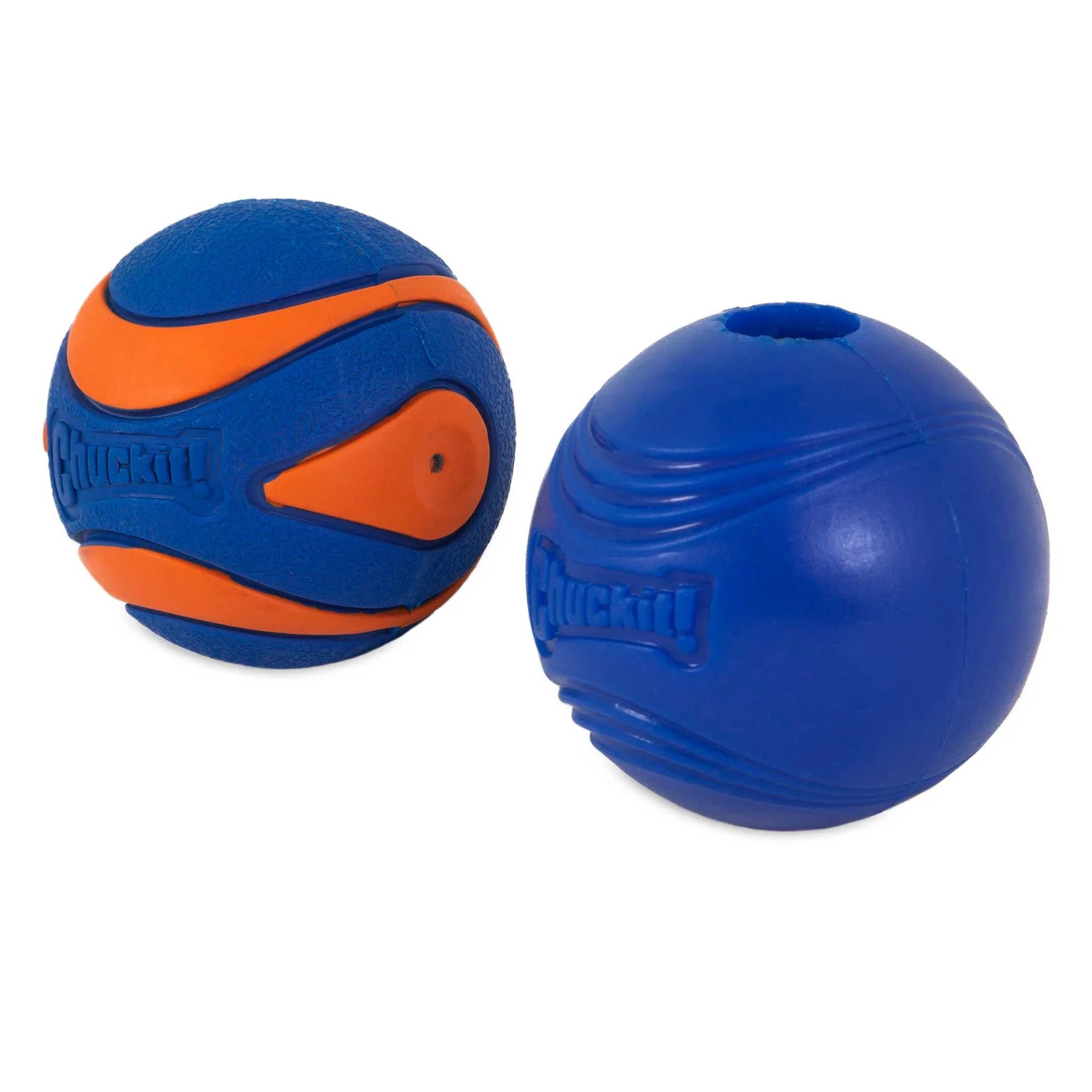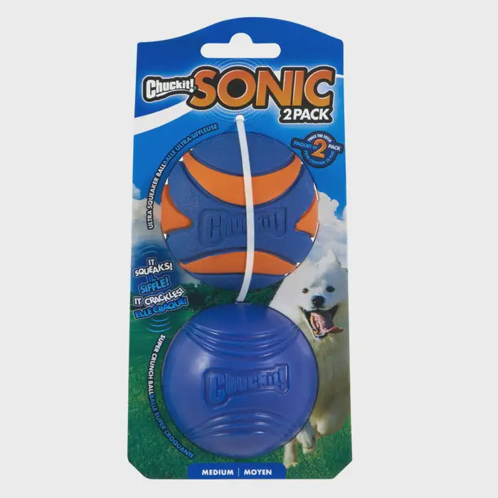 Pet Parents can keep their dog engaged in fetch with the Chuckit!® Sonic Fetch Duo! This fetch pack duo combines two of Chuckit!'s best-selling fetch balls. A Chuckit! Ultra Squeaker and a Chuckit! Super Crunch Ball - combined into one awesome fetch pack any dog will love! Designed to attract and engage a dog in fetch, the Ultra Squeaker gives off a loud squeak when used while the Super Crunch Ball features a patented crackle sound that crinkles and crackles and will not break down with use. Made for fetch, both balls are made from safe, durable materials that are gentle on a dog's mouth and are compatible with medium Chuckit! Launchers. A great value pack set to upgrade fetch time by activating a dog's natural curiosity.