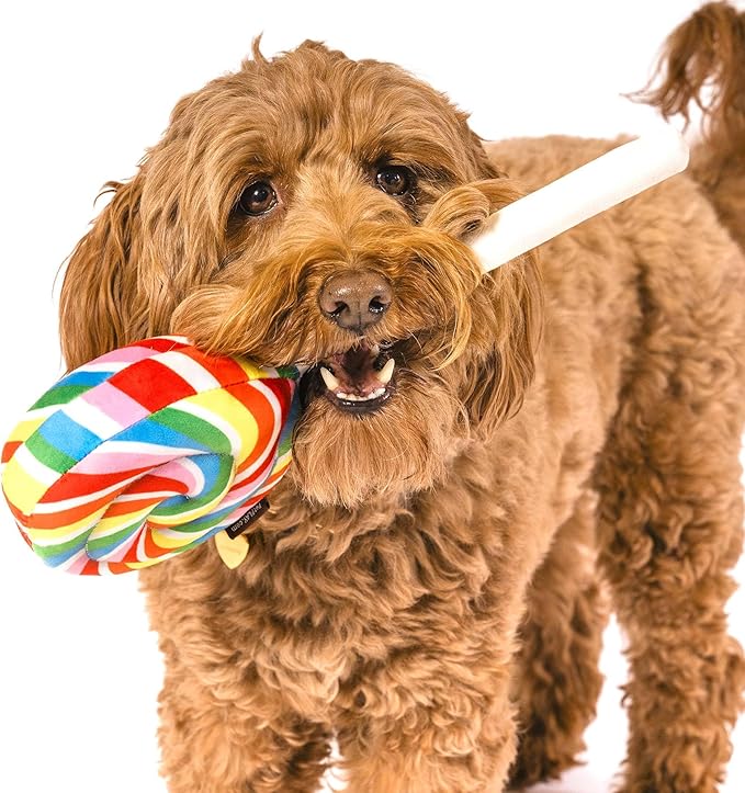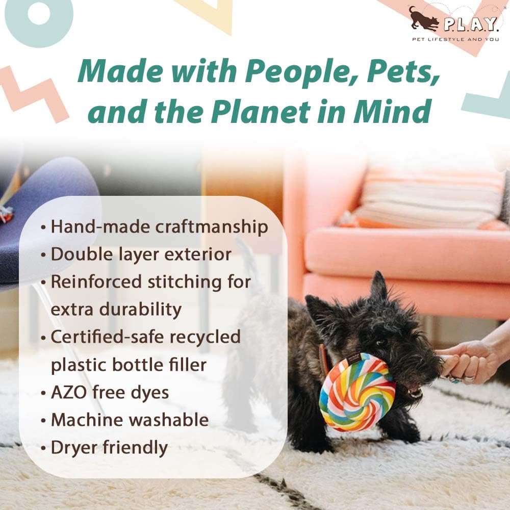 Sweet tooth satisfaction without the dental issues. Make every day a cheat day with P.L.A.Y.’s Snack Attack Plush Dog Toy Collection. All of your guilty pleasures are now in the Lollipup lollipop. Your pup’s sugar rush will never end! Hand-made craftsmanship, double layer exterior and reinforced stitching for extra durability Eco-friendly PlanetFill® filler is made from 100% post-consumer certified-safe recycled plastic bottles